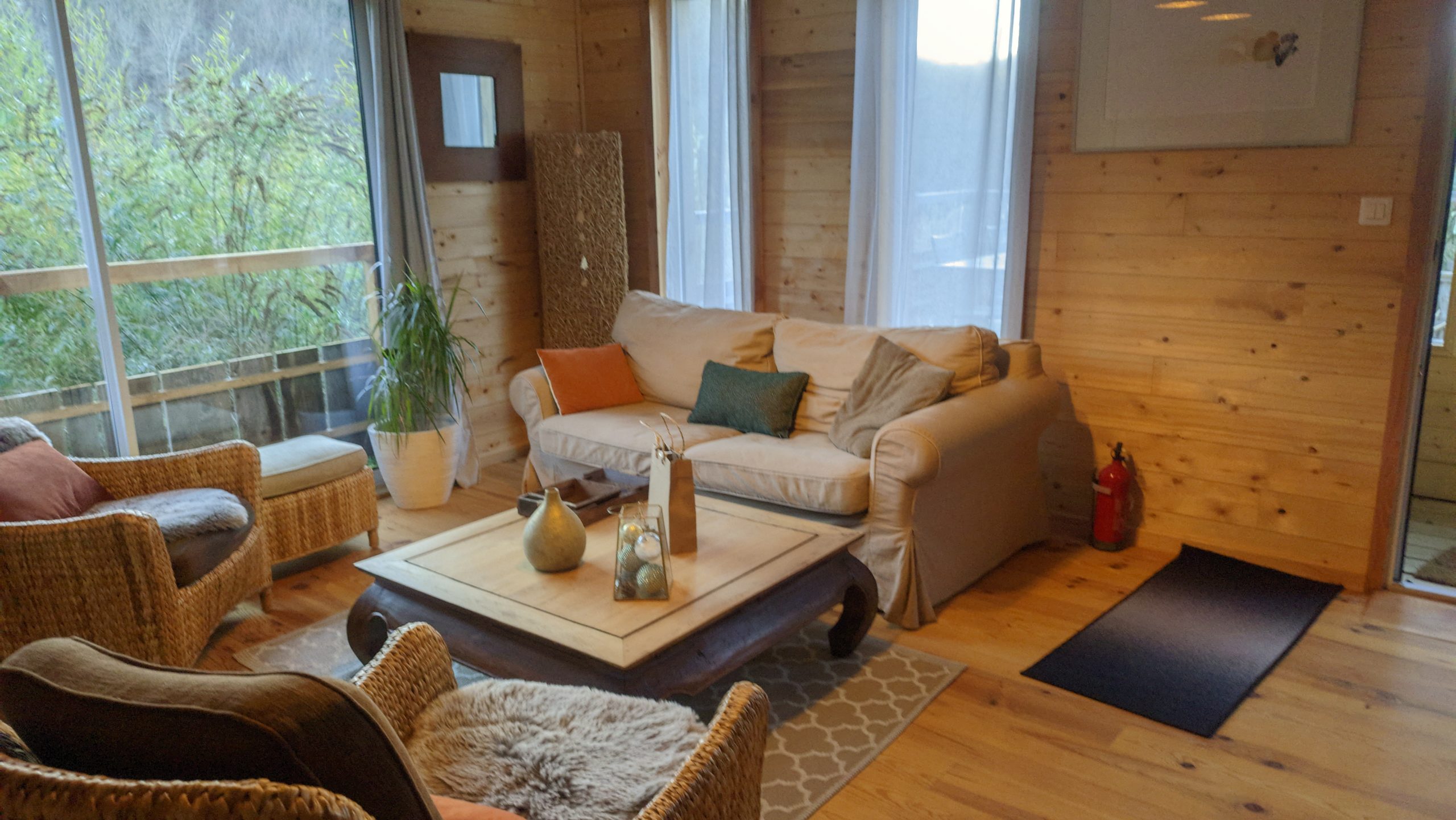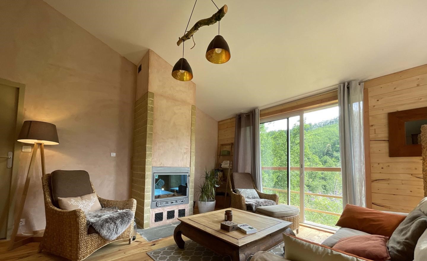 L’intérieur se compose d’un séjour chaleureux et lumineux, doté d’une baie vitrée et d’un insert à bois pour des soirées cocooning. Le salon confortable vous invite à la détente, dans une atmosphère authentique et pleine de charme.